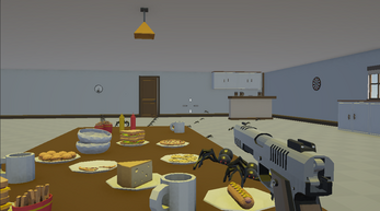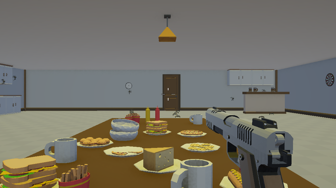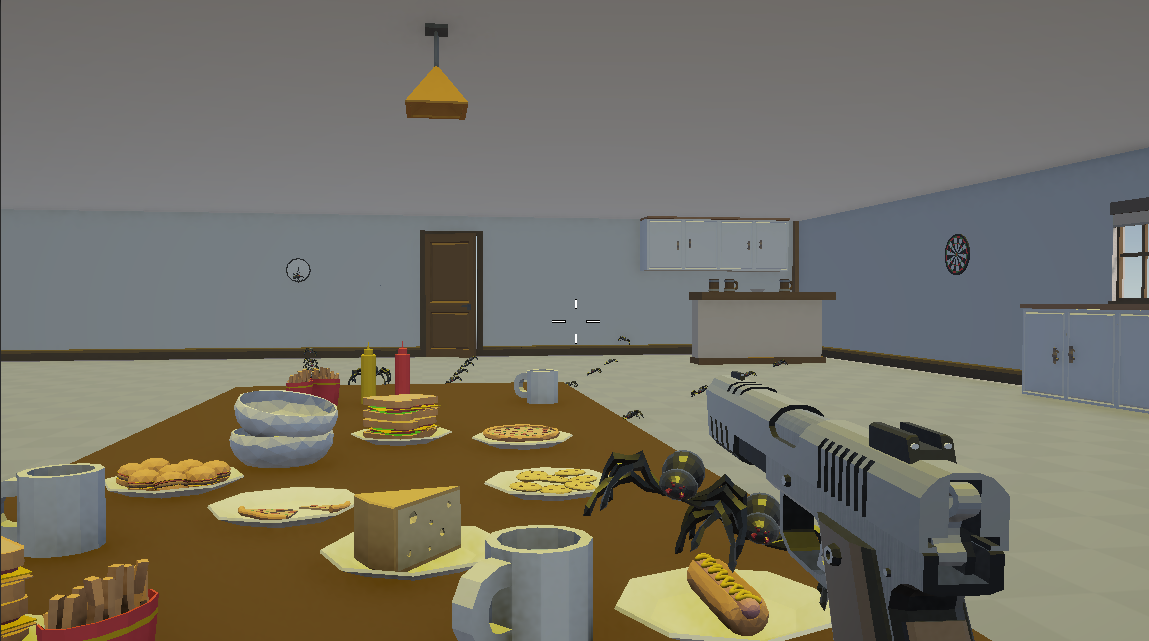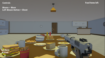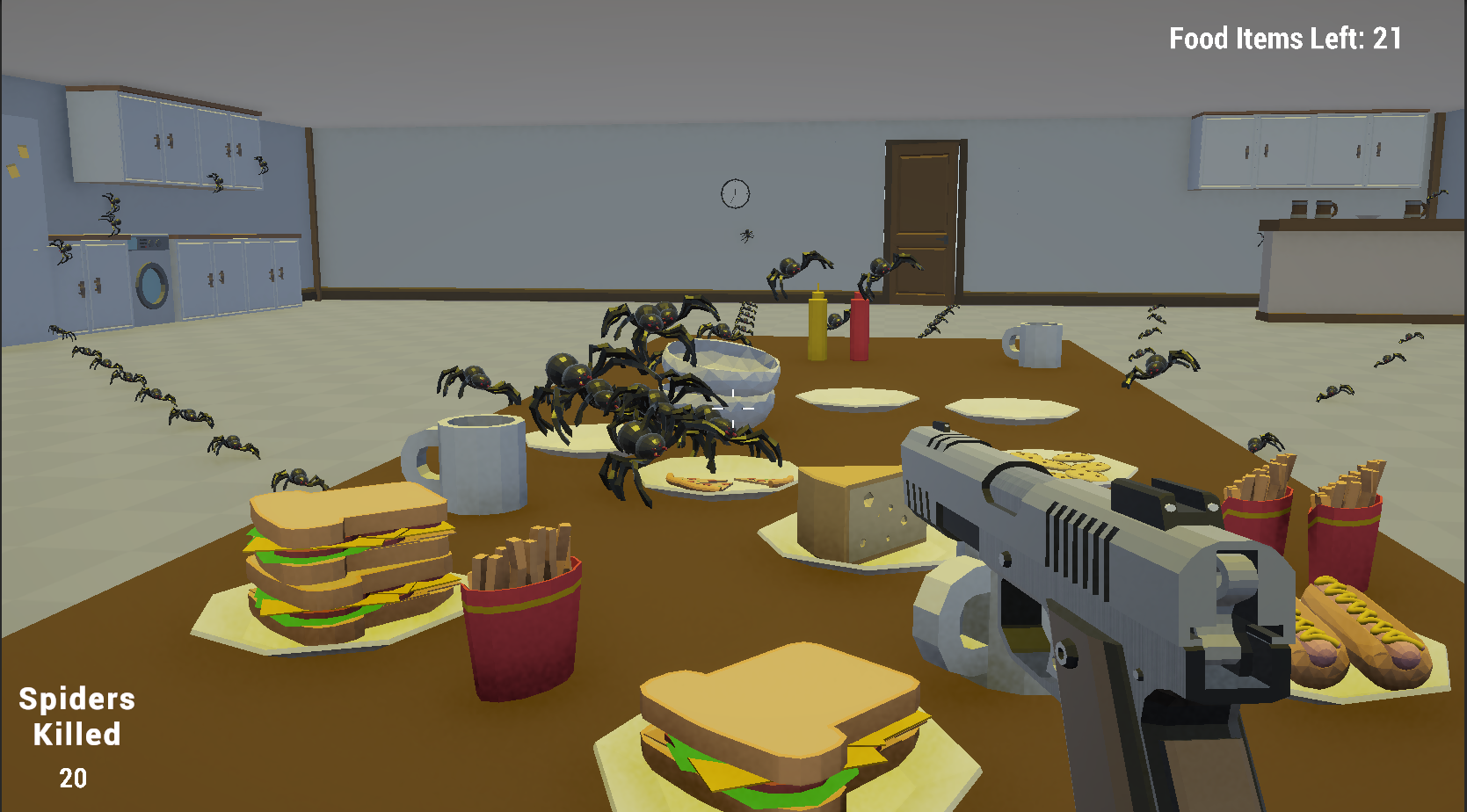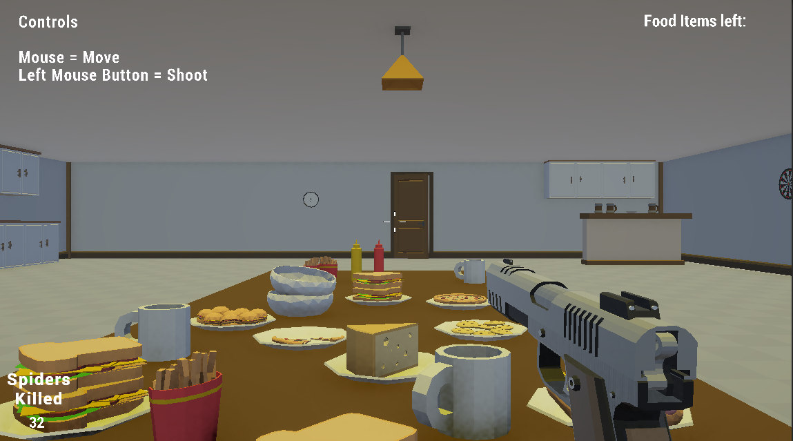 Greedy Spiders is my first attempt at a simple first person shooter where you are sat at the kitchen table with a swarm of spiders heading for the food. I have added some overly dramatic background music just because I wanted to. Kill as many spiders as you can before the food is gone.